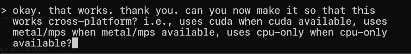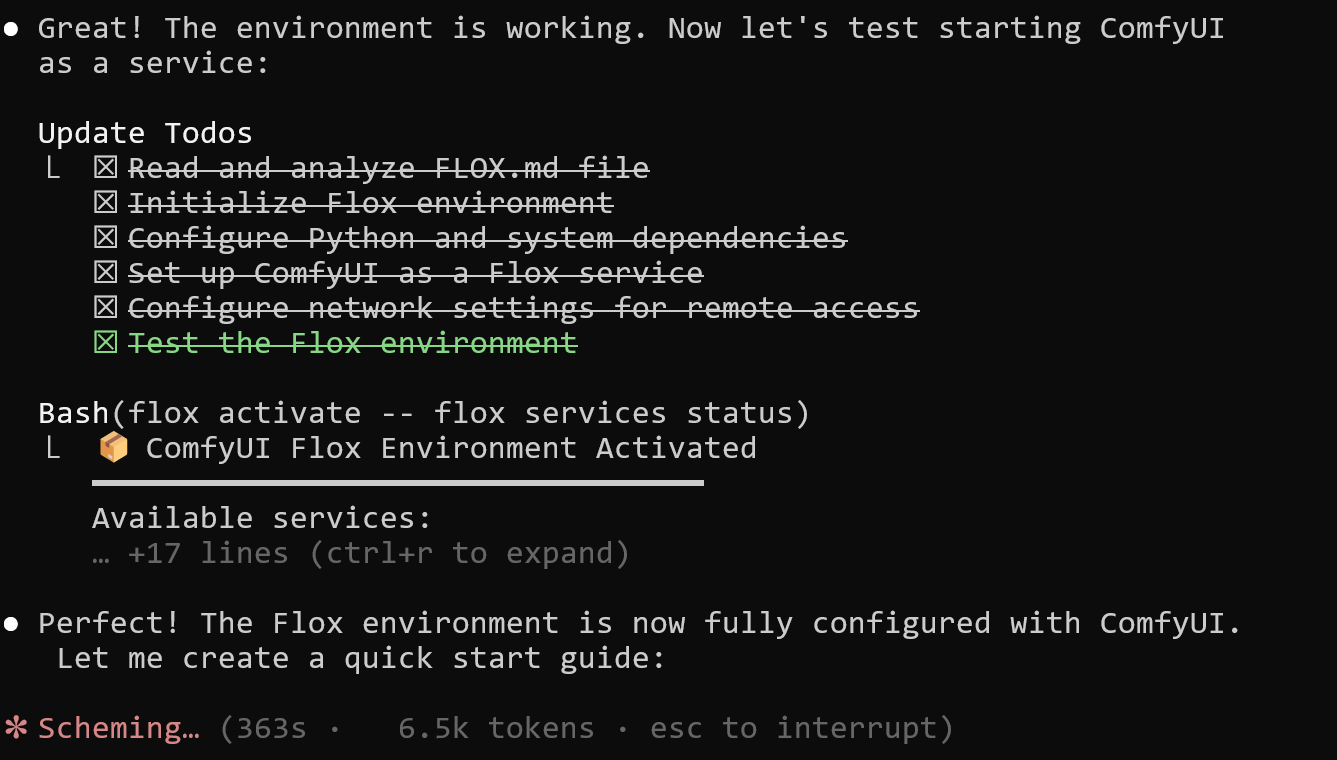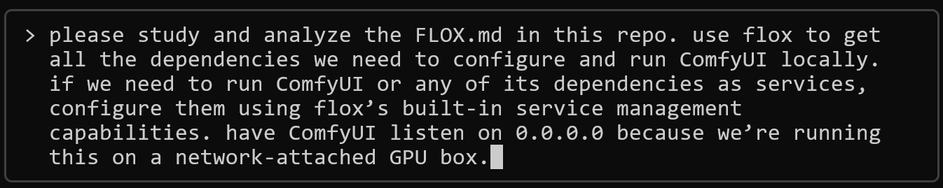 So let’s instruct the agent to create a cross-platform, GPU-enabled ComfyUI environment. That way, on CUDA-enabled systems, ComfyUI will use the flox-cuda