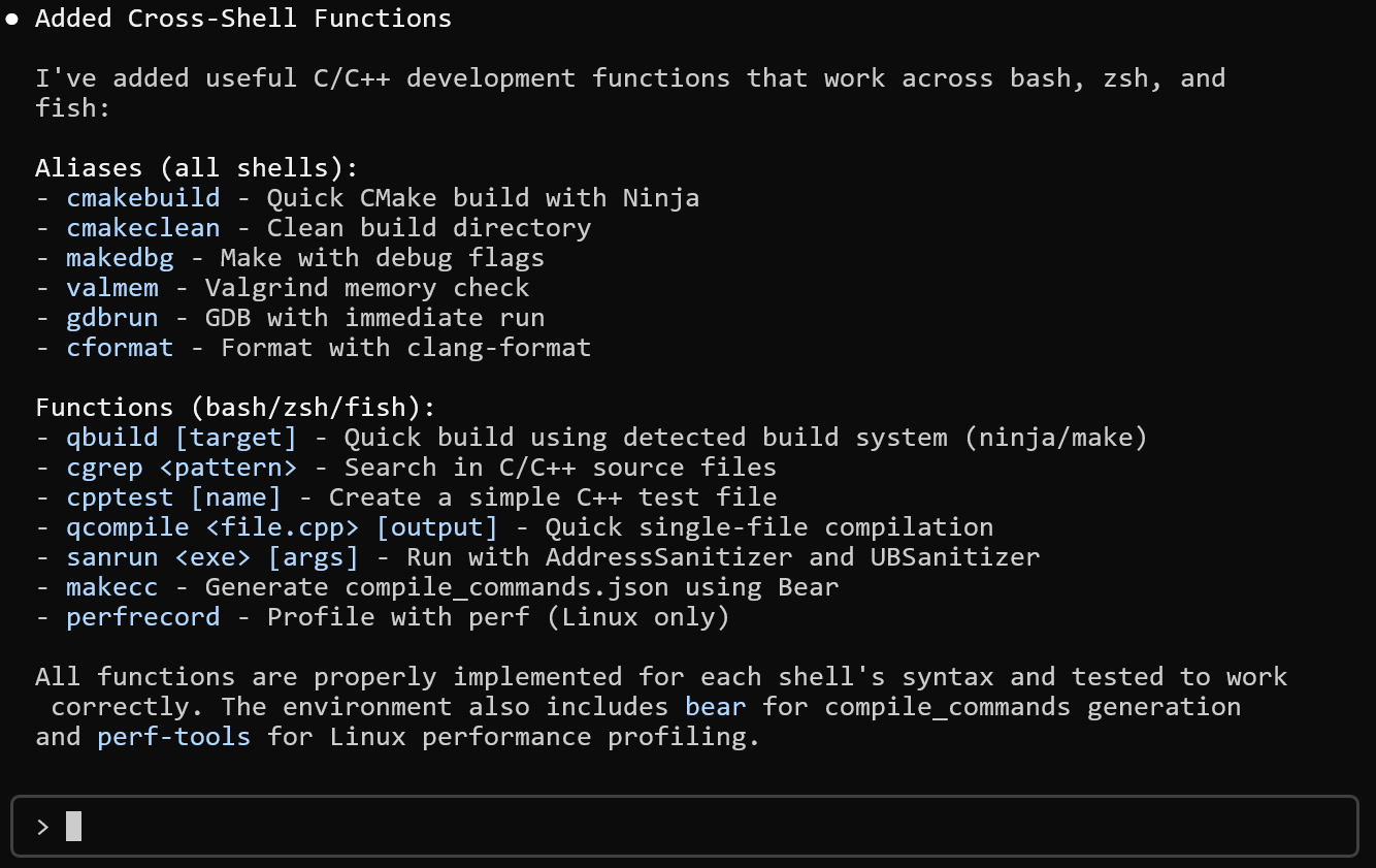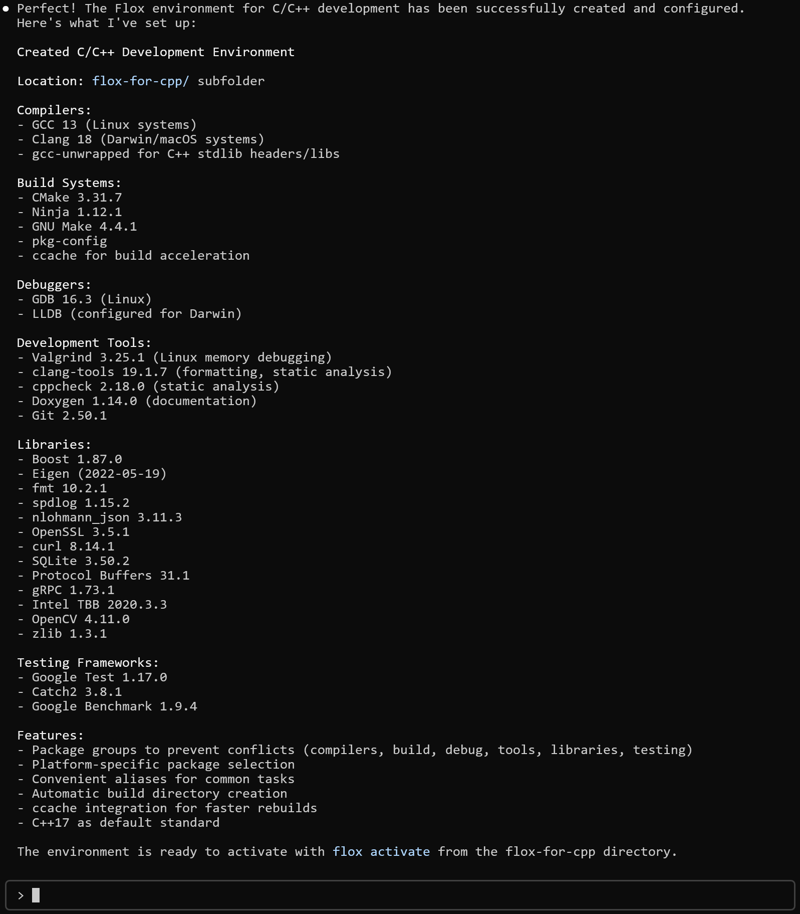 ), switch into it, and initialize the Flox agent development environment. From there, the agent is to build out a functional toolchain for C/C++ work: platform-specific compilers (gcc