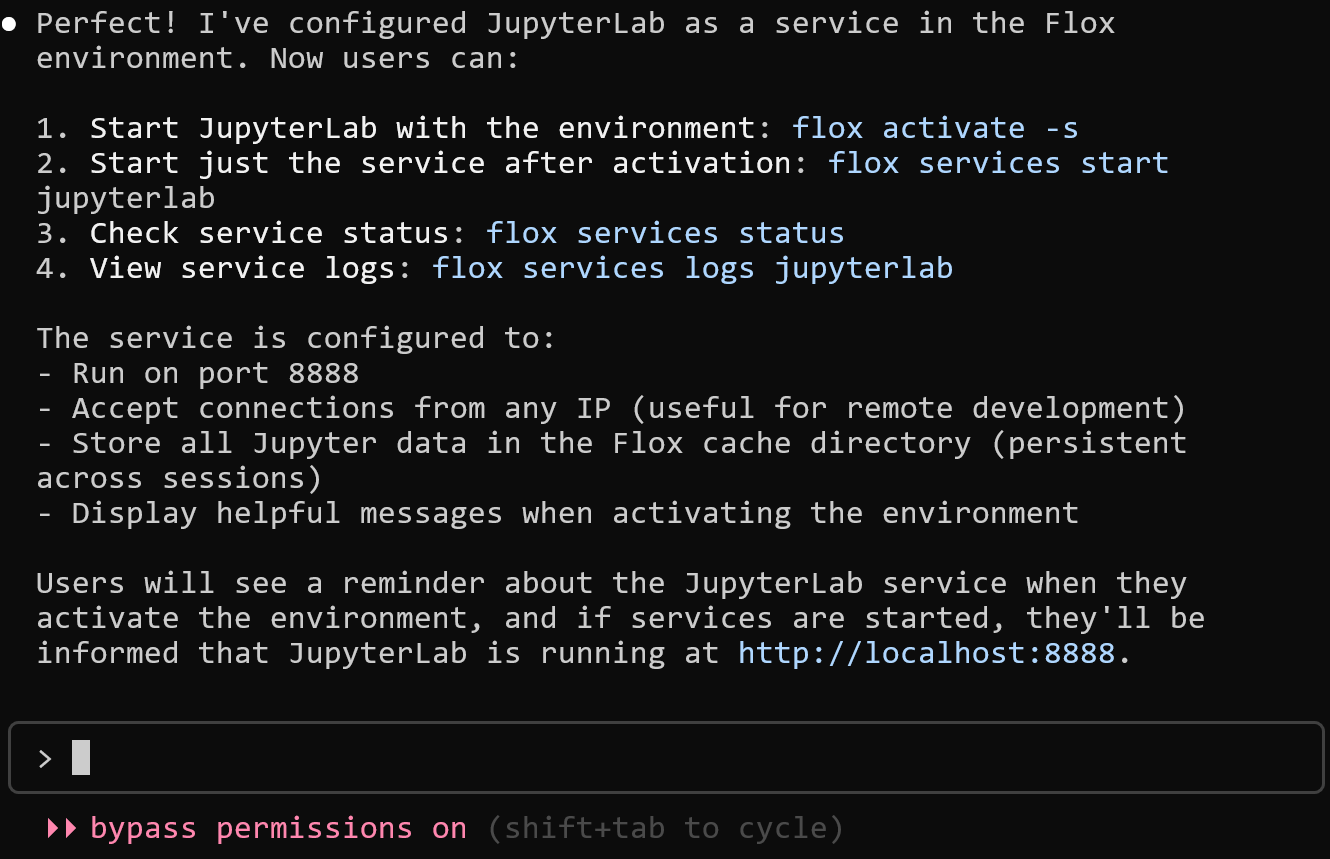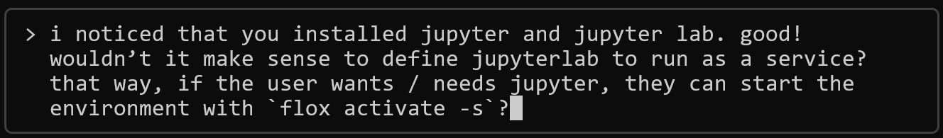 This includes most of what a data engineer might need, along with JupyterLab. But Flox also supports built-in service management, so you (or the agent) can configure it to automatically start and stop your JupyterLab instance. The next prompt directs the agent to define JupyterLab as a Flox-managed service: