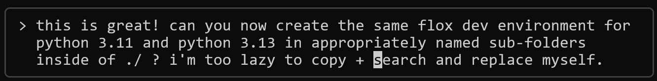 The upshot is that agentic development with Flox can get you from zero to working prototype much more quickly—without modifying your $HOME