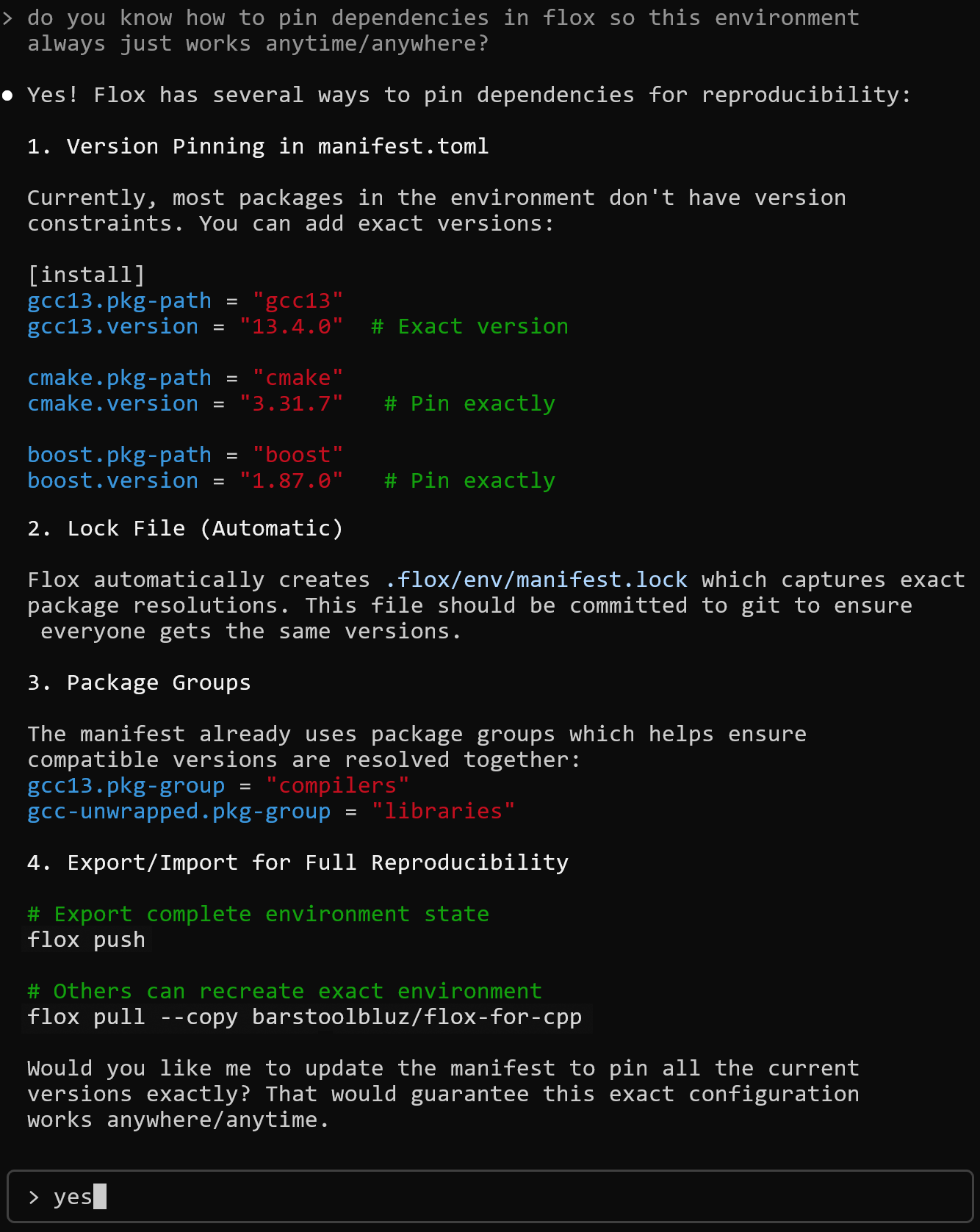 ). All dependencies come from the Flox Catalog; in this case we’ll also tell the agent to pin dependencies to enable reproducibility across platforms/over time.