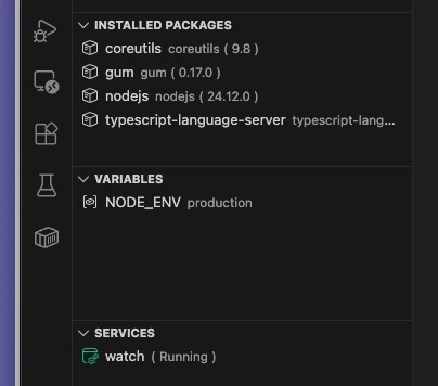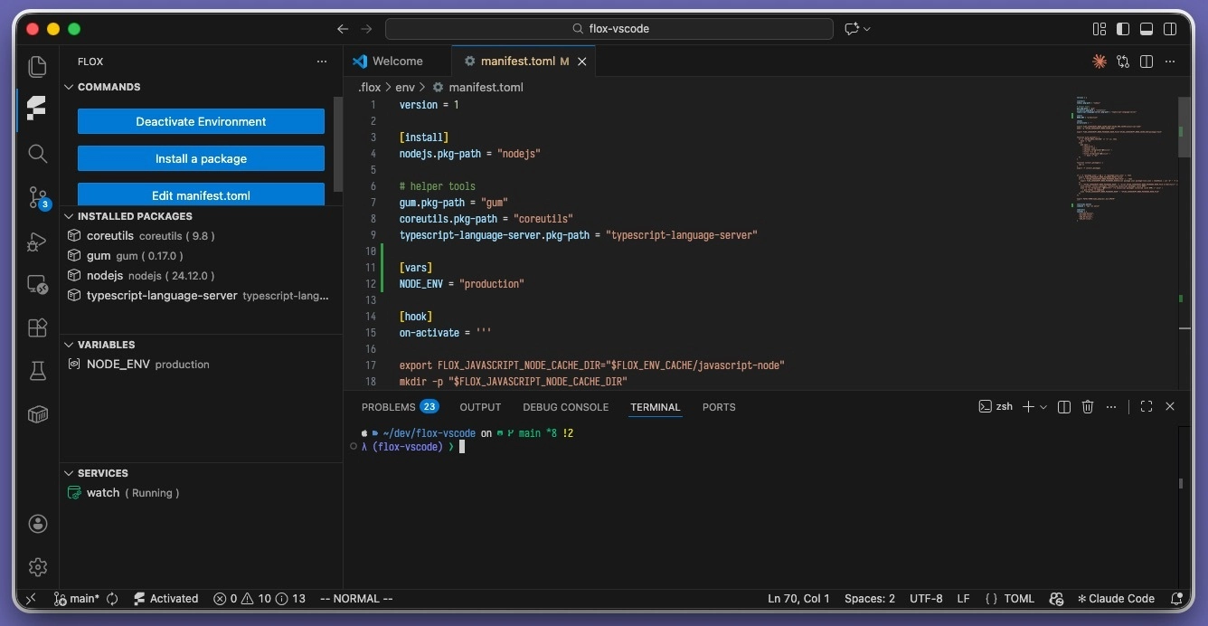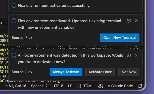 And because it’s VS Code, you can also declaratively edit environments, just as you’d edit or compose code—by making changes to the environment’s TOML manifest, with the same familiar VS Code workflow. Saving your changes prompts the extension to reload your environment and refresh the sidebar. If the manifest contains an error, the extension logs details in Output → Flox. (VS Code doesn’t currently flag the issue inline in the editor.)