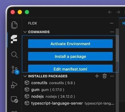 See what packages are installed The VS Code sidebar now gives you an at-a-glance view of what’s in your Flox environment, including installed packages, as well as which versions of packages you’re currently using.